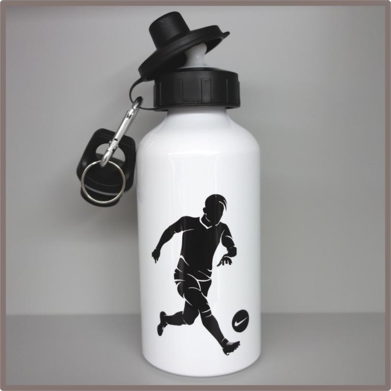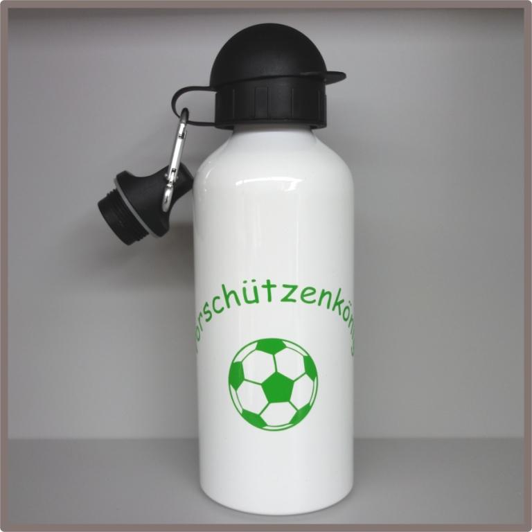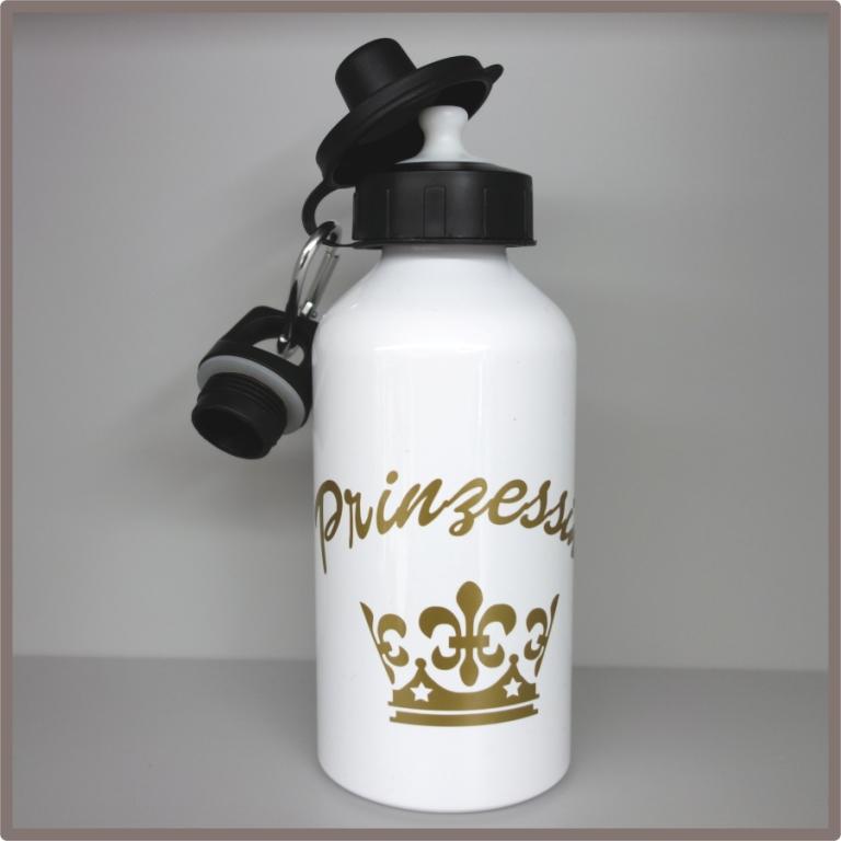 Weiße Aluminium-Trinkflasche mit individueller Beschriftung.