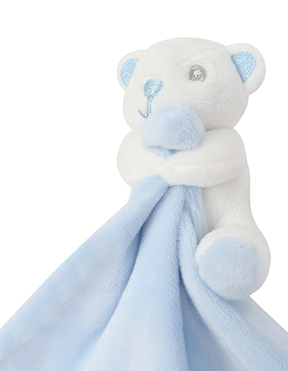 An einer Ecke ist ein Bärchen mit einer internen Rassel im Körper angenäht.